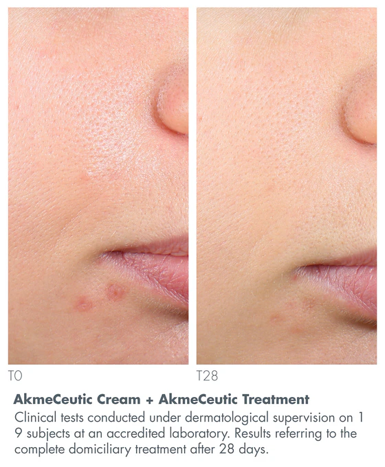 *Clinical tests carried out under dermatological control, on a panel of 19 women aged 18 to 40, at a certified Laboratory; combined use of AKMECEUTIC CREAM + AKMECEUTIC TREATMENT for 28 days.